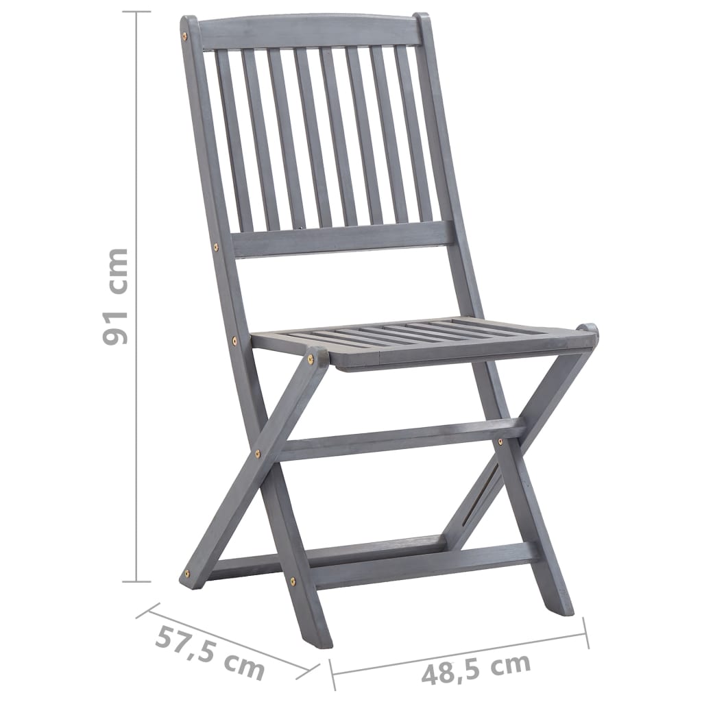 Este prático e elegante conjunto de jantar para jardim em madeira é perfeitamente adequado para utilização no exterior e garante um ponto focal atraente no seu jardim, terraço ou pátio. A mesa e as cadeiras são feitas em madeira de acácia maciça com um acabamento a cinzento lavado. Por conseguinte, são resistentes às intempéries, duráveis e fáceis de limpar com um pano húmido. Graças à estrutura de madeira resistente, o conjunto é muito estável. Proporcionar-lhe-á conforto e uma excelente comodidade para passar tempo com a sua família e amigos. A mesa e as cadeiras podem ser facilmente dobradas para facilitar a arrumação e o transporte quando não estiverem a ser utilizadas. Máximo de 110 kg por lugar.