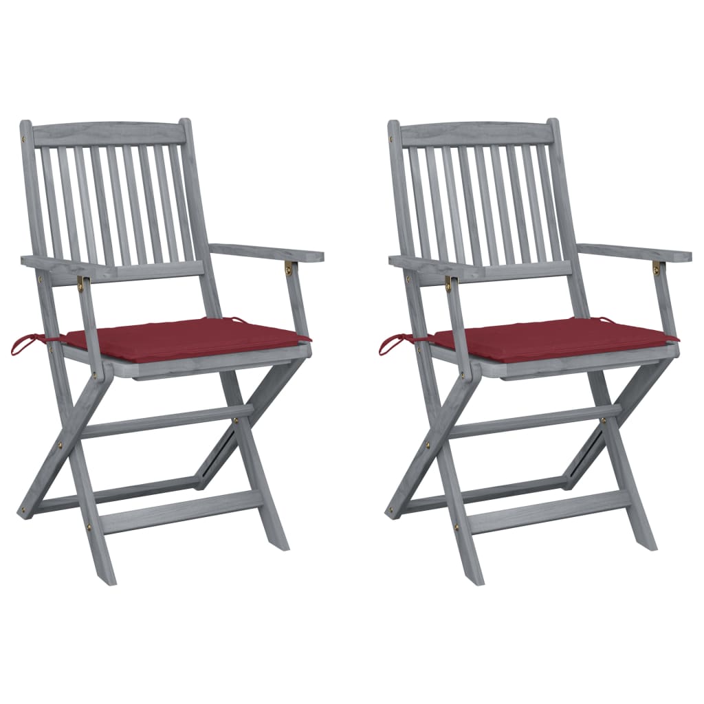 Estas cadeiras de jantar são feitas em madeira de acácia maciça, uma madeira tropical, tornando-as resistentes às intempéries e muito duráveis. A madeira de acácia maciça possui força para suportar o peso e o desgaste causado pelo tempo. A superfície cinzenta lavada é fácil de limpar com um pano húmido. As cadeiras podem ser dobradas para economizar espaço quando não estiverem a ser utilizadas. Os almofadões incluídos proporcionam um conforto adicional enquanto estiver a relaxar ou a jantar. Cada almofadão possui dois conjuntos de tiras para os poder fixar bem às cadeiras.