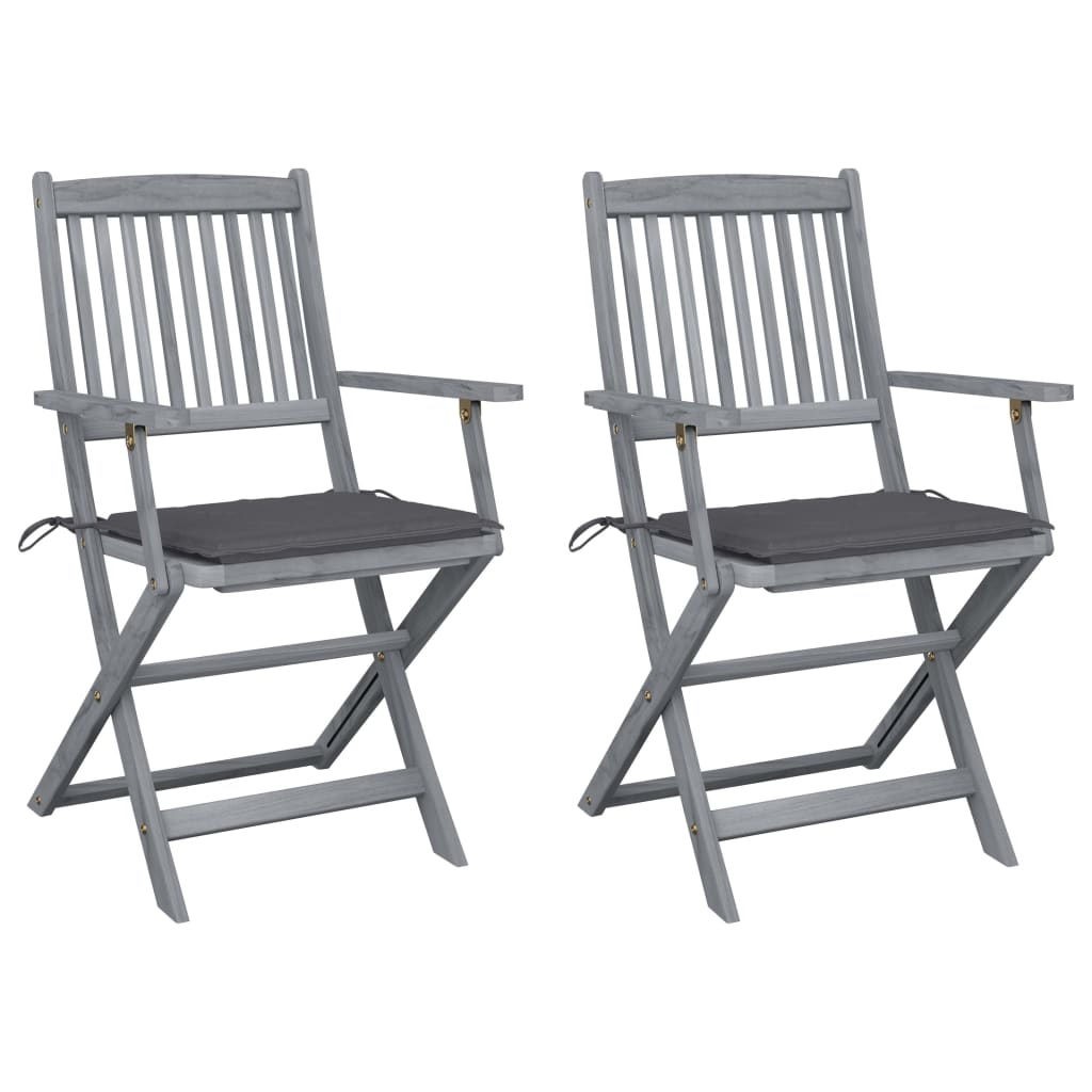 Estas cadeiras de jantar são feitas em madeira de acácia maciça, uma madeira tropical, tornando-as resistentes às intempéries e muito duráveis. A madeira de acácia maciça possui força para suportar o peso e o desgaste causado pelo tempo. A superfície cinzenta lavada é fácil de limpar com um pano húmido. As cadeiras podem ser dobradas para economizar espaço quando não estiverem a ser utilizadas. Os almofadões incluídos proporcionam um conforto adicional enquanto estiver a relaxar ou a jantar. Cada almofadão possui dois conjuntos de tiras para os poder fixar bem às cadeiras.