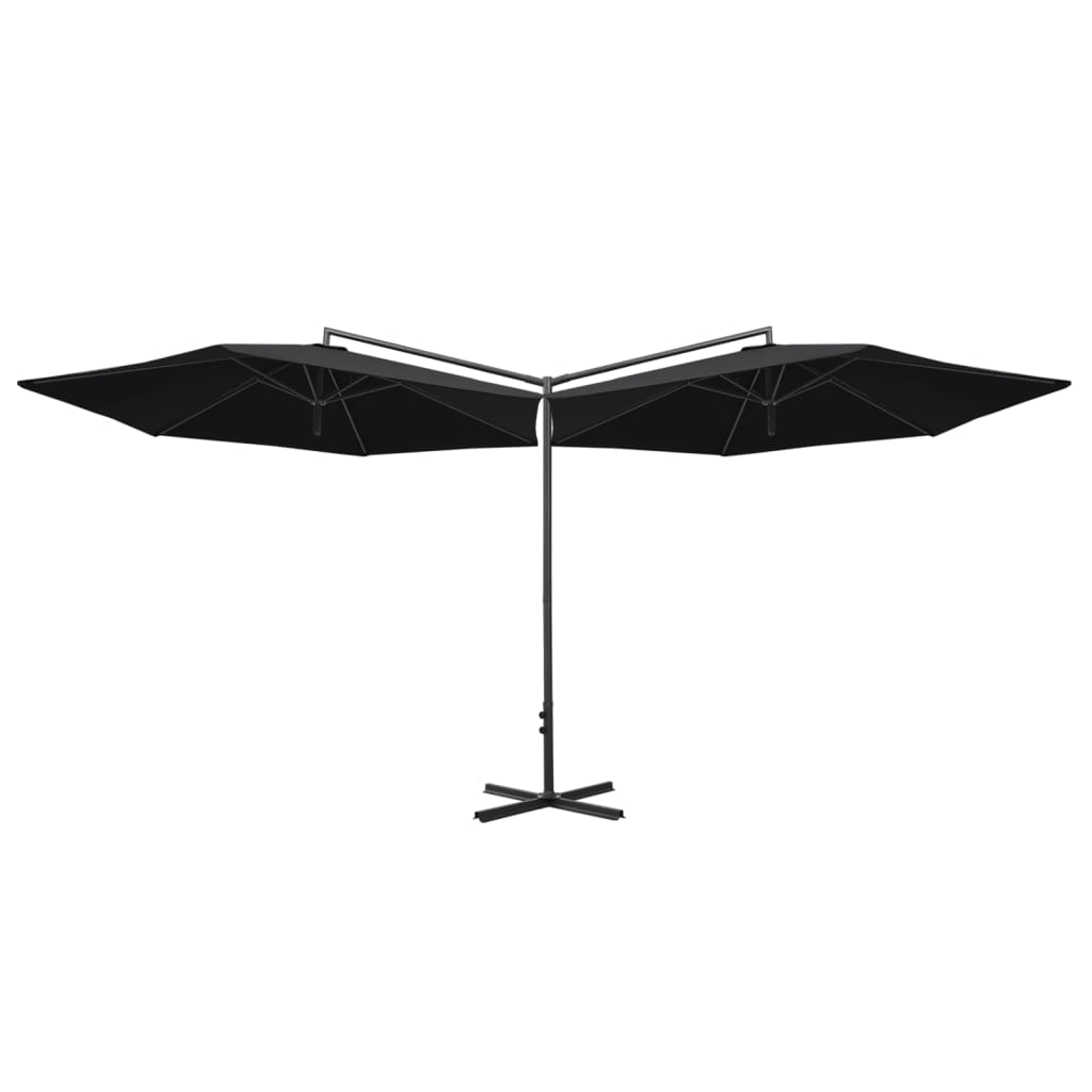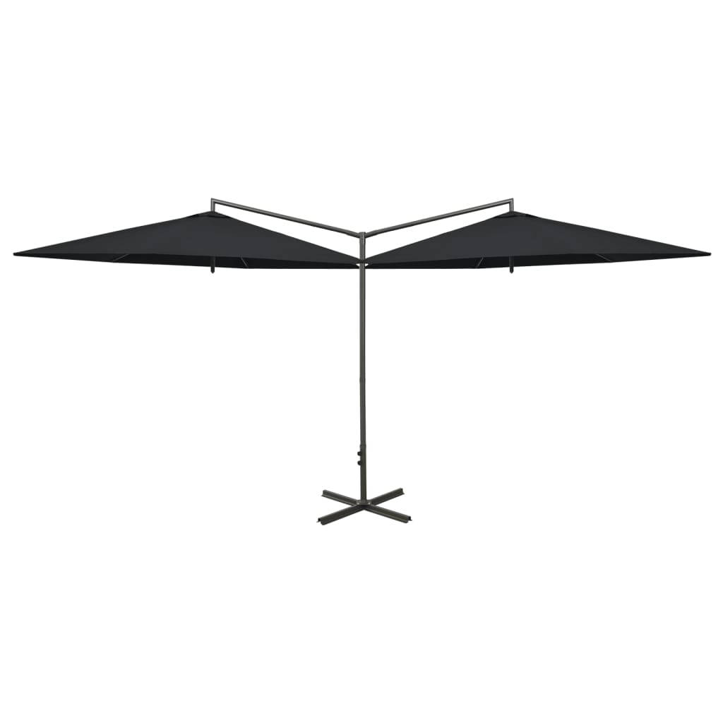 Este guarda-sol é feito de poliéster, o que lhe proporciona uma ótima proteção contra queimaduras solares. O mastro de aço resistente, juntamente com as varetas de aço rígidas, mantém o guarda-sol estável. Apresenta uma base de aço cruzada para acrescentar estabilidade. O design de dois toldos lado a lado torna-o prático, elegante e único, o que não só proporciona um espaço de sombra maior, mas também chama a atenção em qualquer espaço ao ar livre. Também pode ser aberto e fechado facilmente graças ao mecanismo de manivela.