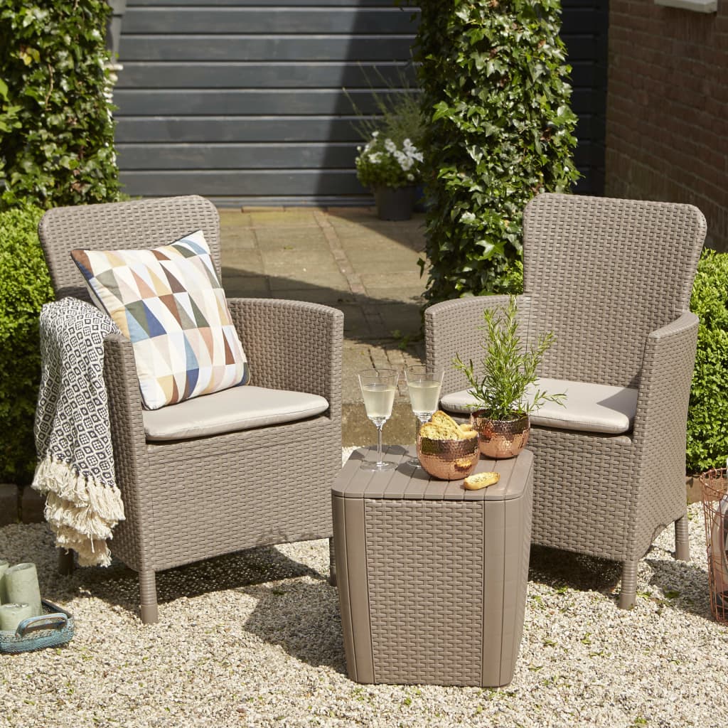 As cadeiras incluídas no conjunto de mobiliário de exterior Miami são muito confortáveis graças às suas costas altas e aos seus almofadões de assento. A mesa incluída possui um compartimento de armazenamento escondido por baixo do tampo. Graças ao plástico à prova de intempéries e impermeável, este conjunto de mobiliário de jardim é fácil de limpar e resistente. Todas as peças são leves, o que as torna fáceis de movimentar.